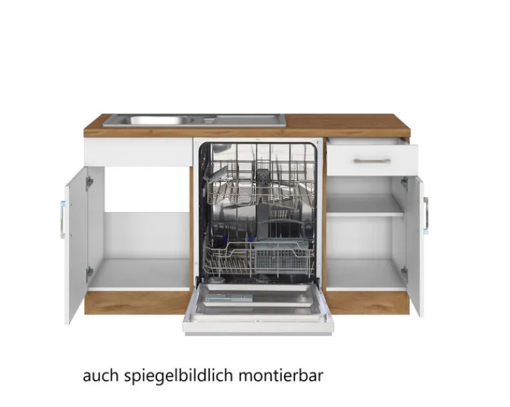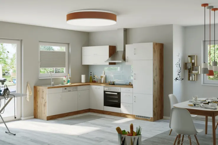 Die Winkelzeile ODENSE misst 210 x 270 cm und präsentiert sich mit einer weitgehend weißen Front sowie Seitenteilen, Arbeitsplatte und Sockelblende in Wotan-Eiche Dekor. Aufgrund ihrer praktischen L-Form bietet sie bei idealer Nutzung der vorhandenen Stellfläche viel Stauraum für Töpfe, Pfannen, Besteck und Co.