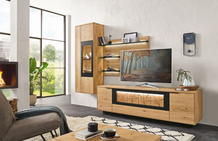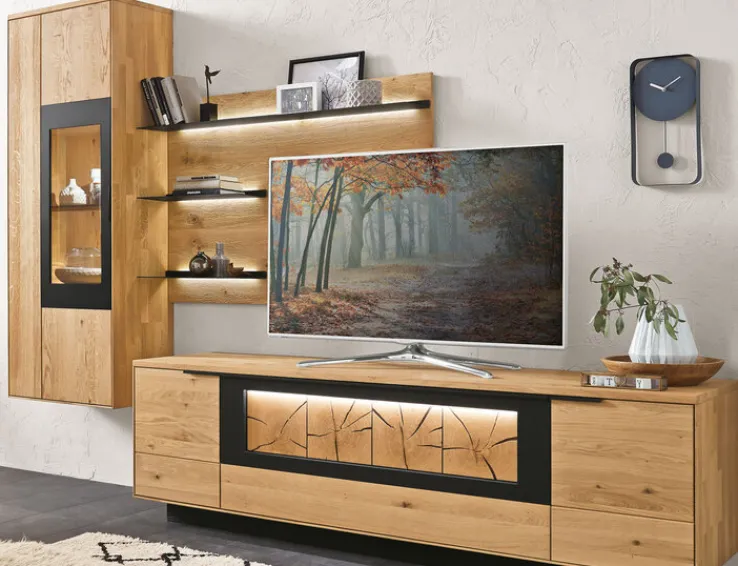 Mit der witlake Wohnwand CORTONA in Wildeiche Massiv erhält das Wohnzimmer einen modernen Look, wirkt aber dennoch gemütlich. Das 3-teilige Wohnzimmermöbel Set bietet zudem viel Platz für alles, was im Wohnzimmer benötigt wird.
