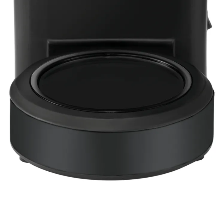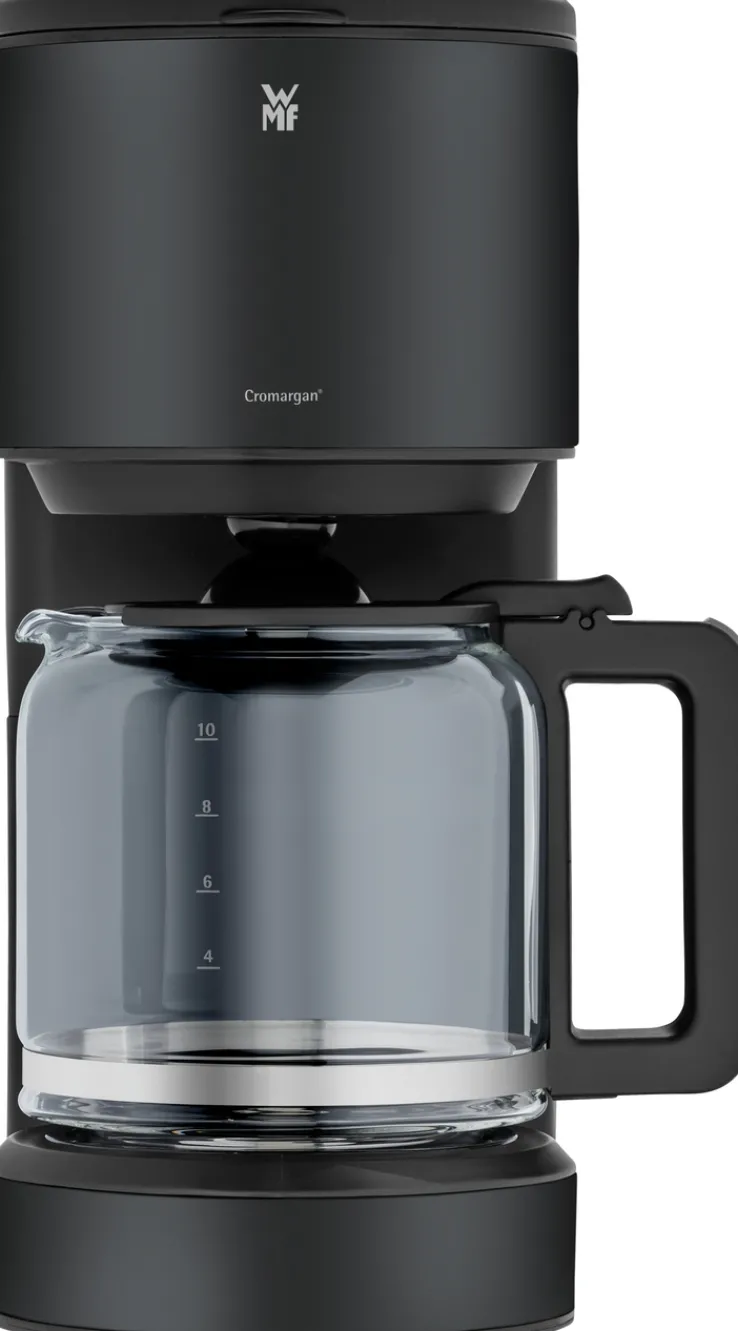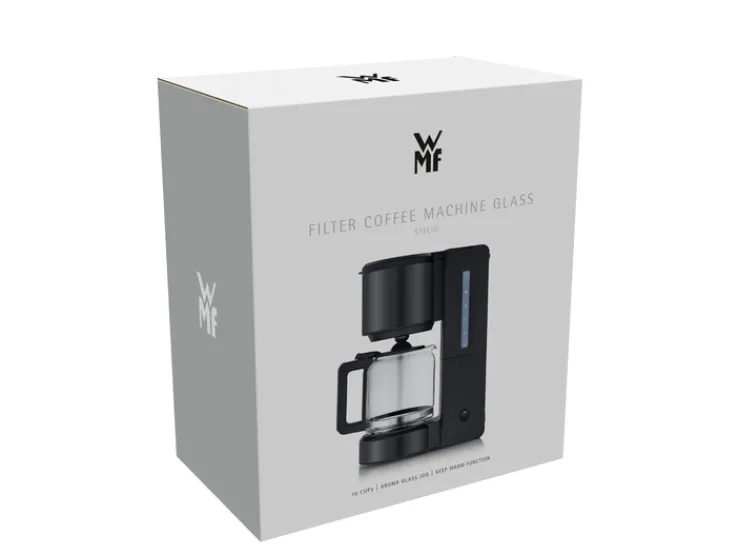 Diese Kaffeemaschine der Serie STELIO BLACK von WMF präsentiert sich in einem klaren, funktionalen Design mit tiefschwarzem Gehäuse. Die Maschine besteht aus einer Kombination von Glas und Metall. Die Hauptfarbe ist Schwarz, ergänzt durch transparente Elemente an der Glaskanne und eine gut ablesbare Wasserstandsanzeige an der Gerätefront. Das kompakte Format mit einer Länge von 18,5 cm, einer Breite von 31,5 cm und einer Höhe von 36 cm eignet sich gut für den Einsatz in der Küche. Das Fassungsvermögen der Kanne beträgt 1.250 ml und das Gewicht der Maschine liegt bei 2,88 kg. Der Griff der Glaskanne ist ergonomisch geformt, und die Maschine verfügt über eine klassische Tastenbedienung. Alle sichtbaren Oberflächen zeigen eine matte bis leicht glänzende Struktur ohne Muster oder Dekor. Die Linienführung ist geradlinig und die Formgebung sachlich. Die Kaffeemaschine ist für den täglichen Gebrauch im Küchenbereich konzipiert.