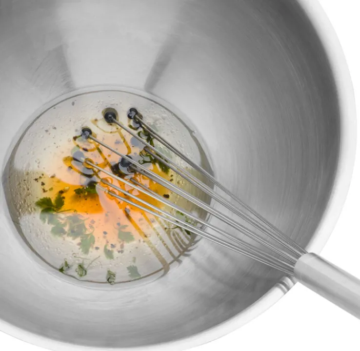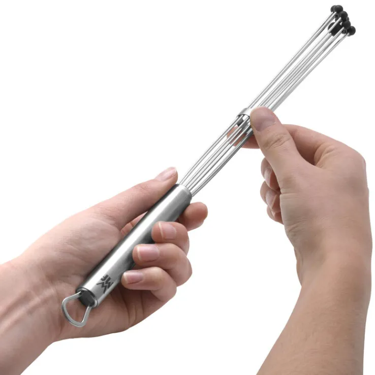 Der innovative WMF Rührblitz PROFI PLUS hat eine Länge von 32 cm. Durch die spezielle Anordnung der Stäbe mit den Kugeln ist der Rührblitz aus silberfarbigem Edelstahl das ideale Küchengerät zum Rühren von Soßen, Marinaden, Dressings, Puddings oder zum Schlagen von kleineren Portionen Sahne. Mit den kleinen Kugeln an den Stäben sind auch die Ränder und die Ecken von Schüsseln und Töpfen sehr gut erreichbar.