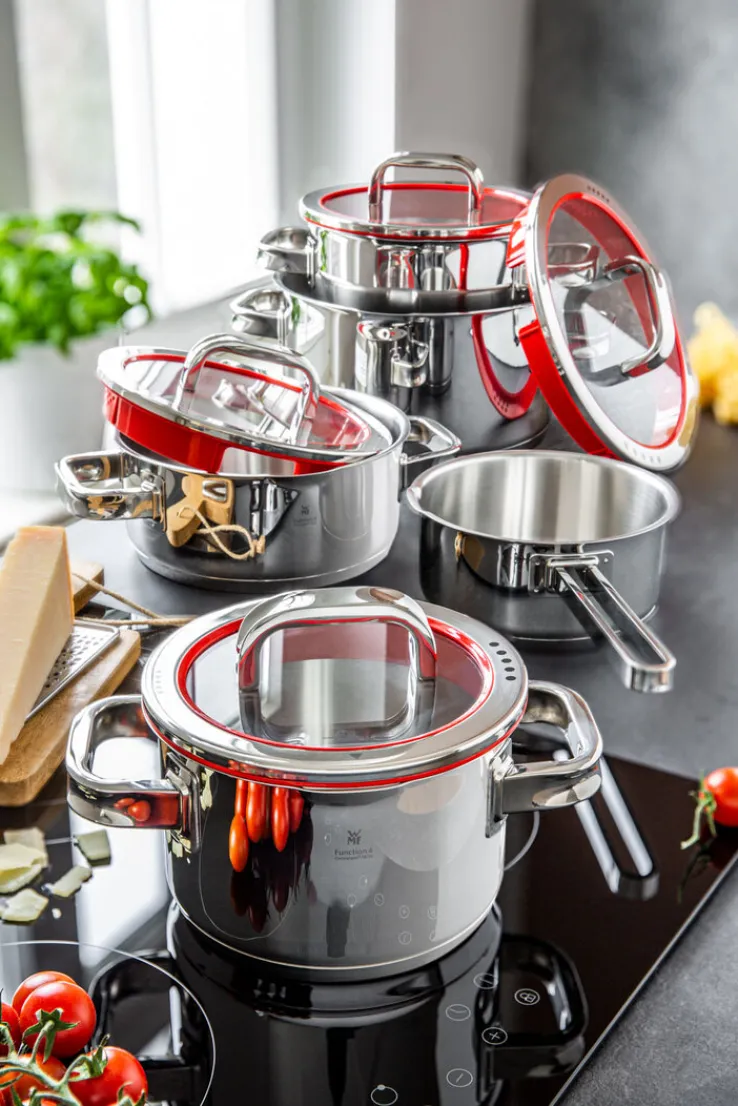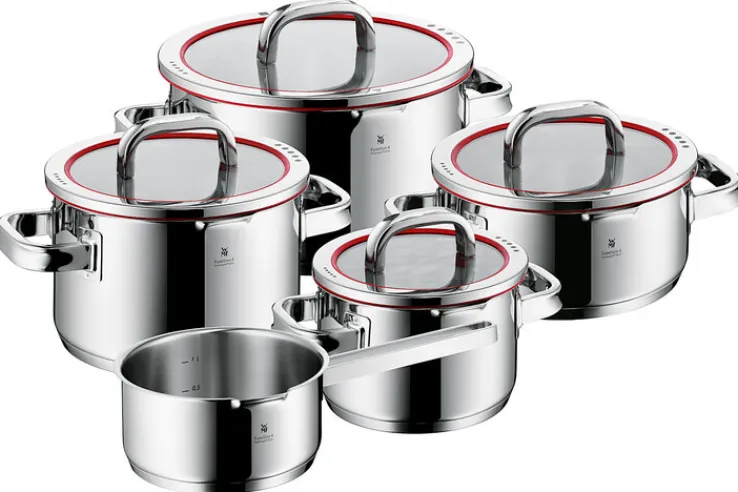 Das WMF Set FUNCTION 4 enthält 5 Töpfe aus silberfarbigem Edelstahl. Jeder der Töpfe ist mit einem Schüttrand ausgestattet. Zu dem Set gehören außerdem 4 passende Glasdeckel, die mit Silikonrändern versehen sind und so ein tropffreies Ausgießen erleichtern. Dank der breiten Griffe lassen sich Töpfe und Deckel sicher und bequem halten. Alle Töpfe mit Innenskalierung.