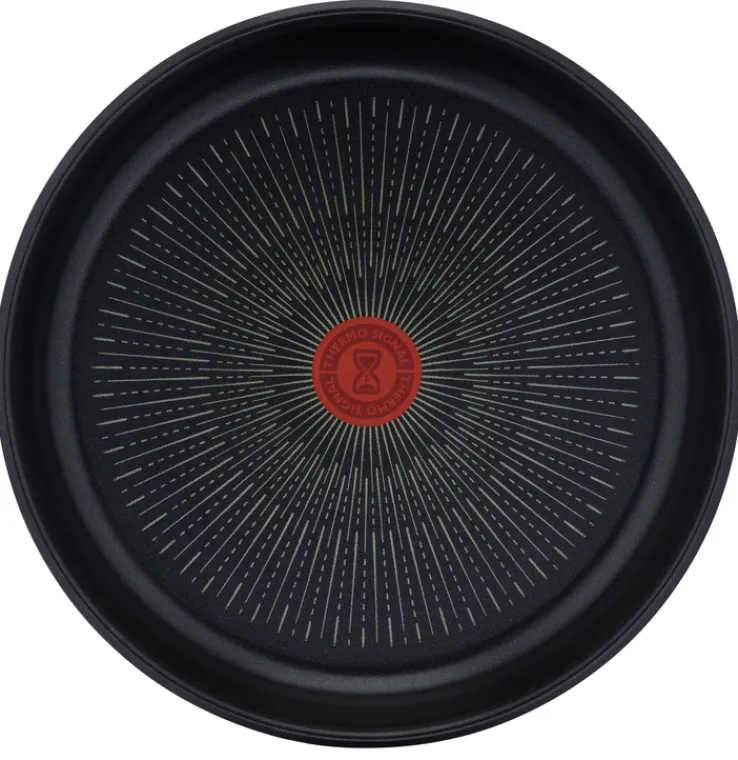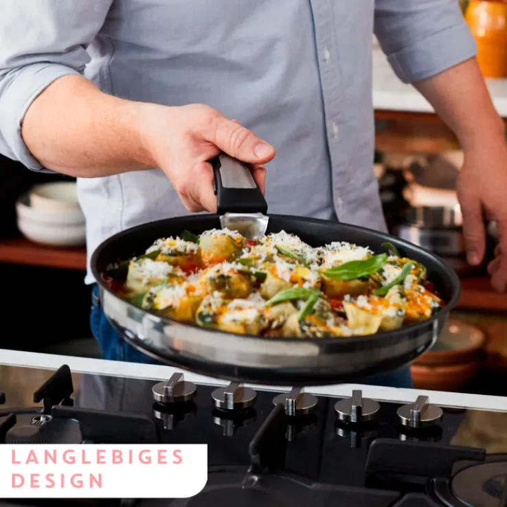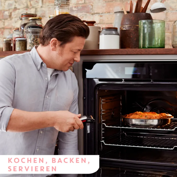 Dieses Topfset aus der Serie JO COOK SMART besteht aus insgesamt fünf Teilen und ist speziell für den Einsatz in der Küche konzipiert. Das Set umfasst zwei Bratpfannen mit einem Durchmesser von 24 cm und 28 cm sowie zwei Stieltöpfe mit Durchmessern von 16 cm und 28 cm. Die Gefäße sind rund geformt und aus silberfarbenem Edelstahl gefertigt, was sich in der glatten, glänzenden Oberfläche widerspiegelt. Die sichtbaren Innenskalierungen in den Töpfen ermöglichen das exakte Abmessen von Flüssigkeiten direkt beim Kochen. Die Pfannen verfügen über eine schwarze Beschichtung mit einem gut erkennbaren, roten Temperaturindikator in der Mitte, der das Erreichen der optimalen Brattemperatur anzeigt. Ein abnehmbarer, ergonomisch geformter Griff in Schwarz und Silber ergänzt das Set, wodurch sich die einzelnen Teile platzsparend stapeln lassen und flexibel im Gebrauch sind. Das Gesamtgewicht des Sets beträgt 2,916 kg. Die robuste Materialauswahl sorgt für eine lange Haltbarkeit und einfache Reinigung im Küchenalltag.