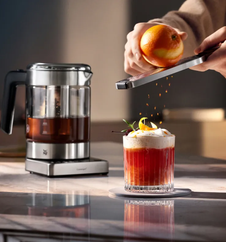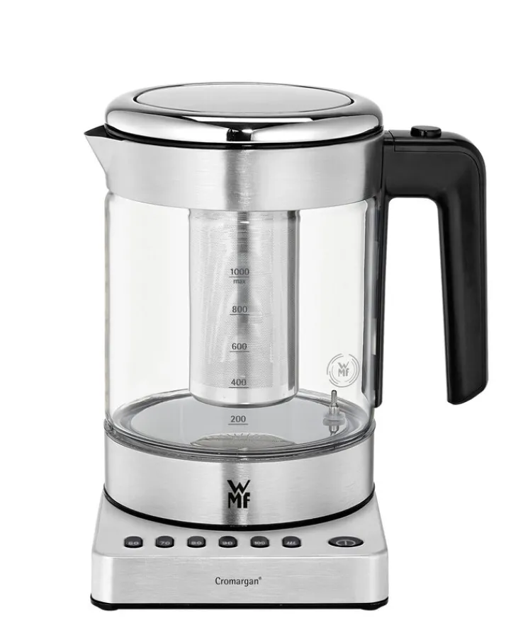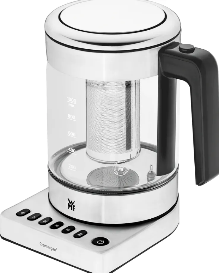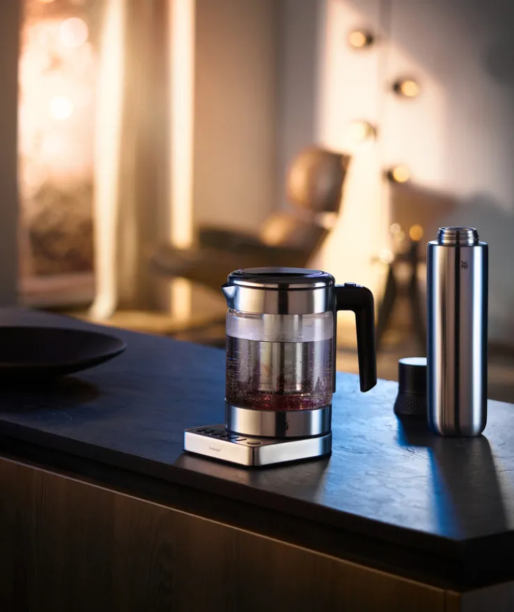 Der WMF Wasserkocher VARIO aus der Serie KÜCHENMINIS hat eine moderne Optik und ist ideal zur variablen Zubereitung von Wasser. Beim Erreichen von 60 °C, 70 °C, 80 °C, 90 °C und 100 °C ertönt ein akustisches Signal. Dadurch hat das Wasser für den Tee immer die gewünschte Temperatur. Der hochwertige Glasbehälter ist mit einem herausnehmbaren Behälter für offenen Tee und einem Kalkfilter ausgestattet. Der Gerätesockel hält das erwärmte Wasser bis zu 20 Minuten auf Temperatur.