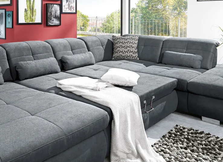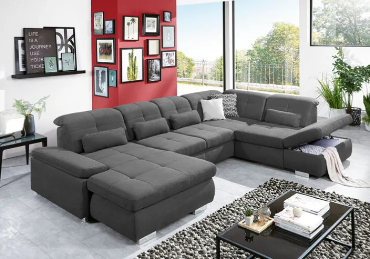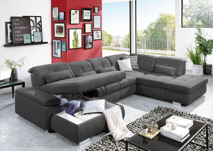 Die YoungLife Wohnlandschaft RAGUSA SF besteht aus einem Canape mit Armteil auf der linken Seite, einem 2,5 Sitzer Sofa, einer Spitzecke und einem 1,5 Sitzer mit Anstellhocker. Alle Elemente kombinieren einen robusten Korpus mit einem bequemen Polsteraufbau mit Kaltschaumkern und sind mit anthrazitfarbigem Textil bezogen. Metallfüße und Abnäher unterstreichen das trendige Design der Wohnlandschaft. Neben der modernen Optik überzeugt die Sofagarnitur mit ihren Funktionen. Mit Schlaffunktion, Sitztiefenverstellung und verstellbarem Armteil ist für einen hervorragenden Sitz- und Liegekomfort gesorgt. Zudem sind das Canape und der Antellhocker mit einem praktischen Bettkasten ausgestattet. Nach Hause kommt die Wohnlandschaft zudem mit vier Nierenkissen und vier Zierkissen.