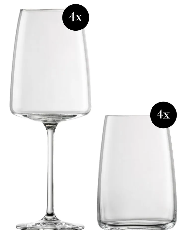 Bei dem 8-teiligen, transparent designten Gläser-Set VIVID SENSES handelt es sich um ZWIESEL GLAS. Mit dem Set werden vor allem Liebhaber eines guten Weines glücklich. Da zum Wein häufig Wasser gereicht wird, beinhaltet das hier gebotene Set mit vier Weingläsern und vier Trinkgläsern alle Glasvarianten, die es für ein genussreiches Weinerlebnis erfordert.