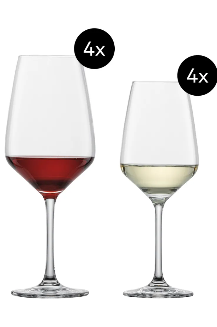 Setartikel: jaAnzahl Teile im Set: 8 Stk.Höhe Setartikel 1: 22,5 cmSetartikel-Inhalt 1: RotweingläserAnzahl Setartikel-Inhalt 1: 4 Höhe Setartikel 2: 21,1 cmSetartikel-Inhalt 2: WeißweingläserAnzahl Setartikel-Inhalt 2: 4 Durchmesser Setartikel 1: 8,7 cmDurchmesser Setartikel 2: 7,9 cmVolumen/Fassungsvermögen Setartikel 1: 497 mlVolumen/Fassungsvermögen Setartikel 2: 356 ml