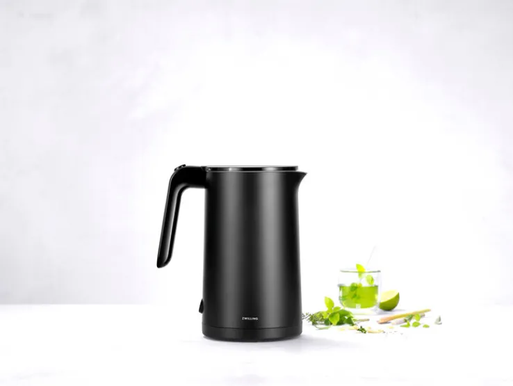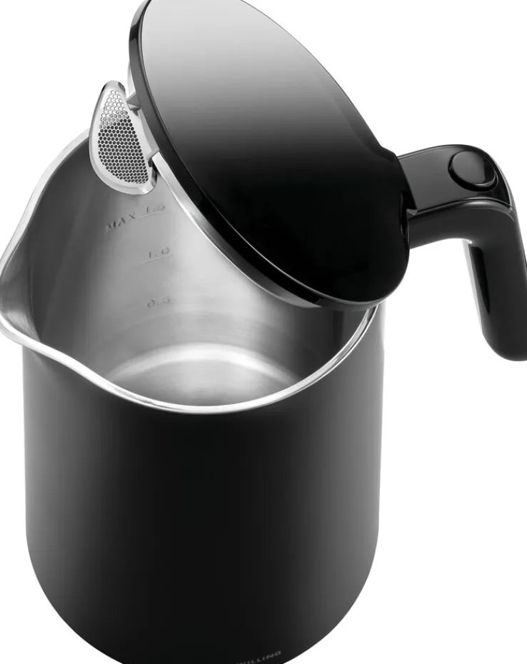 Der schwarzfarbige Wasserkocher von ZWILLING hat ein Fassungsvermögen von 1500 ml und überzeugt durch sein zeitloses Design und seine Funktionalität. Durch seine schlichte Gestaltung passt er in die modern oder klassisch eingerichtete Küche und eignet sich optimal zum Erhitzen von Wasser für Tee, Kaffee oder auch für Babynahrung. Für einen Trockengeh- und Überhitzungsschutz sorgt im Wasserkocher eine automatische Abschaltung. Ein besserer Geschmack des erhitzten Wassers ist durch den eingebauten Kalkfilter aus Edelstahl möglich.