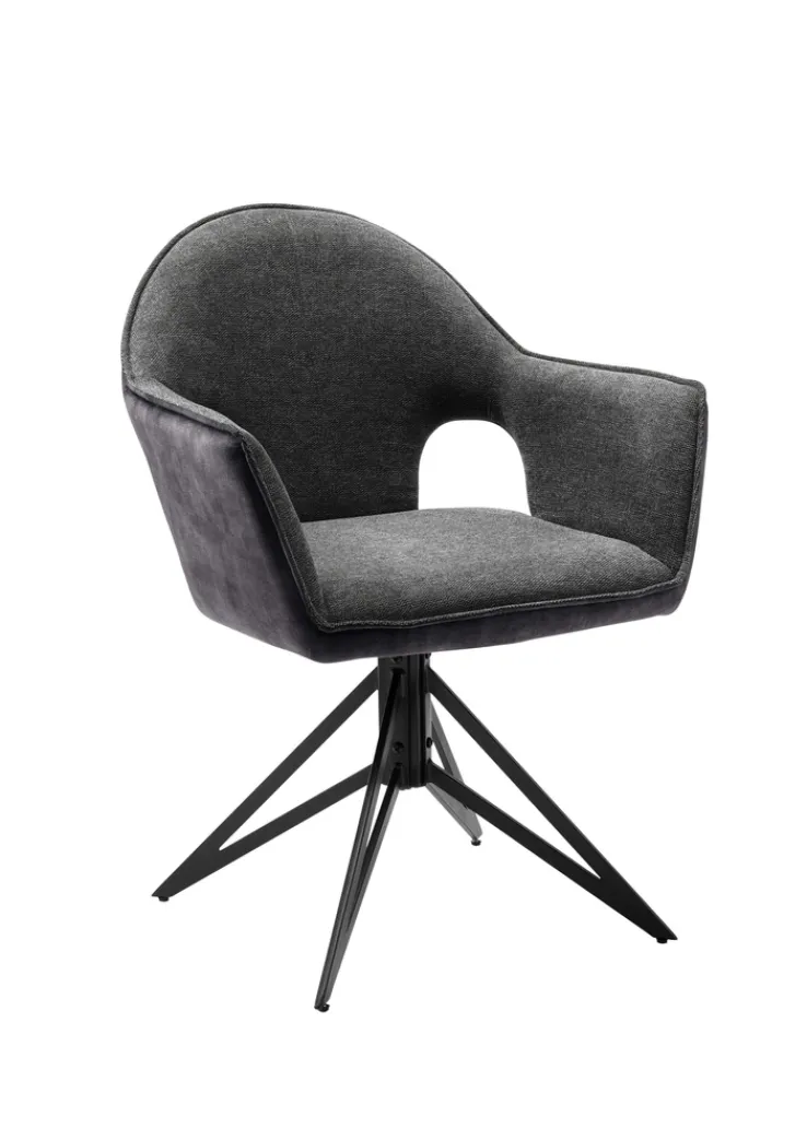 Der Armlehnstuhl MERLE vereint modernes Design mit hoher Funktionalität. Mit einer Breite von 62 cm, einer Höhe von 85 cm und einer Tiefe von 66 cm bietet er komfortablen Sitzkomfort. Die Sitzhöhe beträgt 50 cm, während die maximale Belastbarkeit bei 120 kg liegt. Der Stuhl ist in einem eleganten Anthrazit gehalten, das durch die Kombination von grauem und schwarzem Textil sowie einem stabilen Metallgestell aus Eisen ergänzt wird.