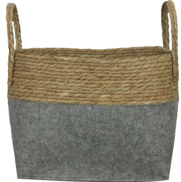 Der Aufbewahrungskorb Seegras misst in Breite und Höhe 38 x 24 cm. Seine Farben sind Grau und Braun. Der Dekokorb ist mit 2 Tragehenkel ausgestattet. Er zeigt eine Seiloptik aus dem Naturmaterial Seegras und einen grauen Filz. Seine Tiefe beträgt 24 cm.