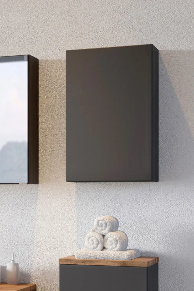 Der graue Bad-Hängeschrank BREGENZ ist mit den Maßen 40 Zentimeter Breite, 20 Zentimeter Tiefe und einer Höhe von 64 Zentimetern die ideale Ergänzung in jedem Bad, in dem Stauraum benötigt wird. Die beiden Einlegeböden hinter der Drehtür sind nach Wunsch in der Höhe verstellbar.