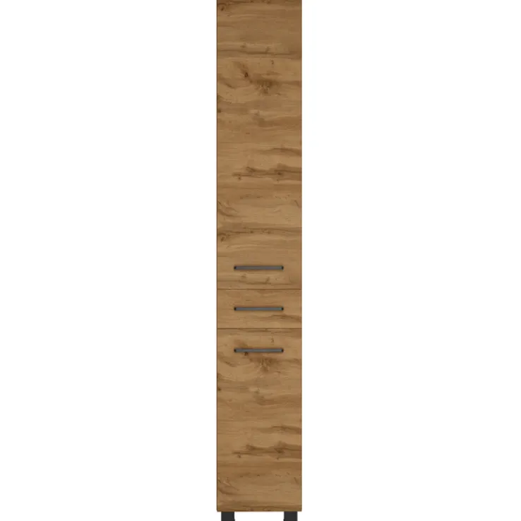 Der Bad-Seitenschrank LIMBURG in Braun ist 180 cm hoch, 30 cm breit und 35 cm tief. Er ist aus Wotaneiche Nachbildung, verfügt über 2 Türen mit Soft Close und 4 Einlegeböden.