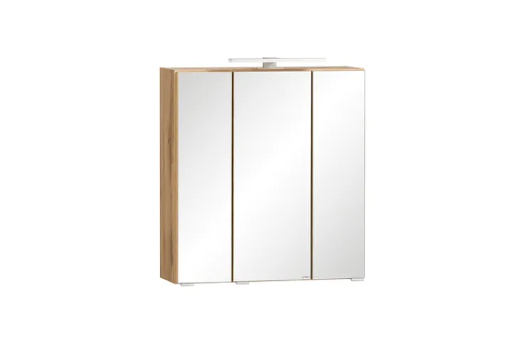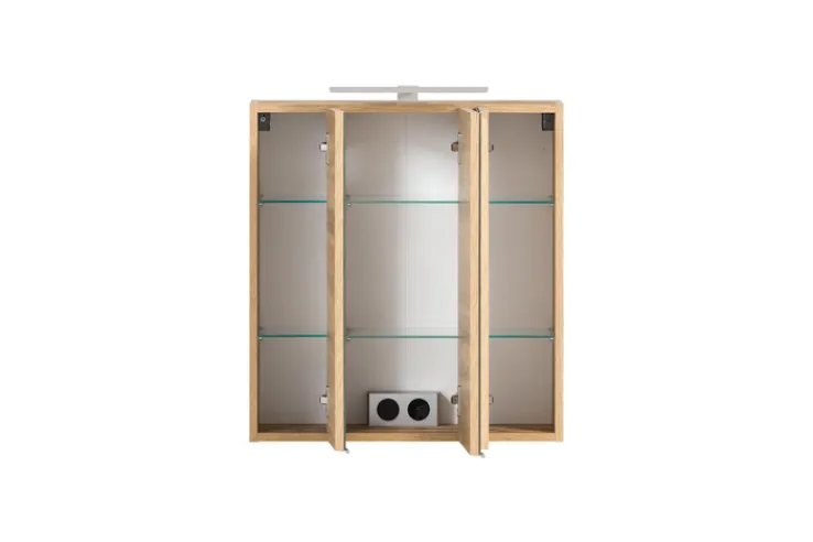 Der Schrank verfügt über drei Spiegeltüren, die nicht nur für eine klare Sicht sorgen, sondern auch den Raum optisch vergrößern. Im Inneren befinden sich sechs Einlegeböden, die eine flexible Aufbewahrung ermöglichen. Eine integrierte Beleuchtung sorgt für optimale Lichtverhältnisse, ideal für die tägliche Pflege. Die Dekorfarbe in Eiche und die Holzdekor-Optik verleihen dem Schrank eine natürliche und warme Ausstrahlung.