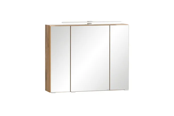 Der weiß-braune Bad-Spiegelschrank GENT ist 80 cm breit, 20 cm tief und 64 cm hoch. Ausgestattet mit einer LED-Aufbauleuchte in Edelstahloptik, punktet das Möbelstück durch viel Stauraum.