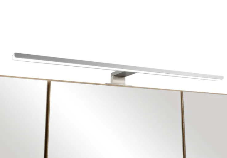 Der Bad-Spiegelschrank verfügt über drei Spiegeltüren. Im Inneren befinden sich hinter jeder Türe jeweils zwei Glaseinlegeböden für Bad-Utensilien. Diese sind höhenverstellbar. Der moderne Badschrank ist innerhalb des Korpus mit einer Steckdose sowie einem Lichtschalter ausgestattet. Hier ist es möglich, zum Beispiel einen Rasierer oder Föhn anzuschließen. Das gesamte Produkt besteht aus einer Holznachbildung. Als Dekorfarbe dient hier Eiche. Die Schrankvorderseite ist vollständig bespiegelt. Der Bad-Spiegelschrank GENT ist mit weiteren Produkten der Reihe kombinierbar.