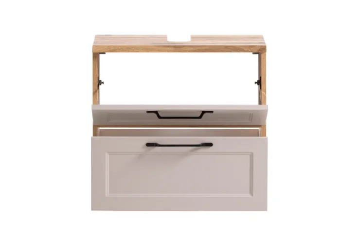 Der Bad-Unterbeckenschrank LÜTTICH misst 60 x 54 x 35 cm und besteht aus solider Holznachbildung. Während der Korpus in rustikaler Wotan-Eiche gehalten ist, sorgen die Fronten in Kaschmir mit Kassettenoptik für einen eleganten Look. Hinter der Klappe mit Soft-Close-Funktion und in der Schublade bietet der Waschbeckenunterschrank Platz für Handtücher & Co. Ein Pluspunkt ist auch der Siphonausschnitt in der Oberplatte, der die Installation des Waschbeckens deutlich erleichtert.