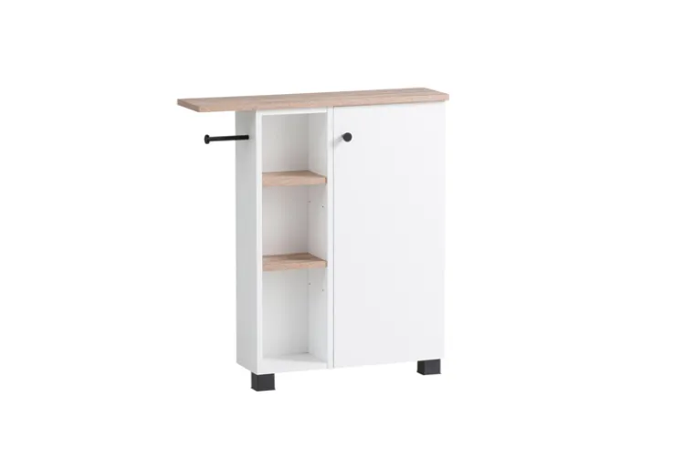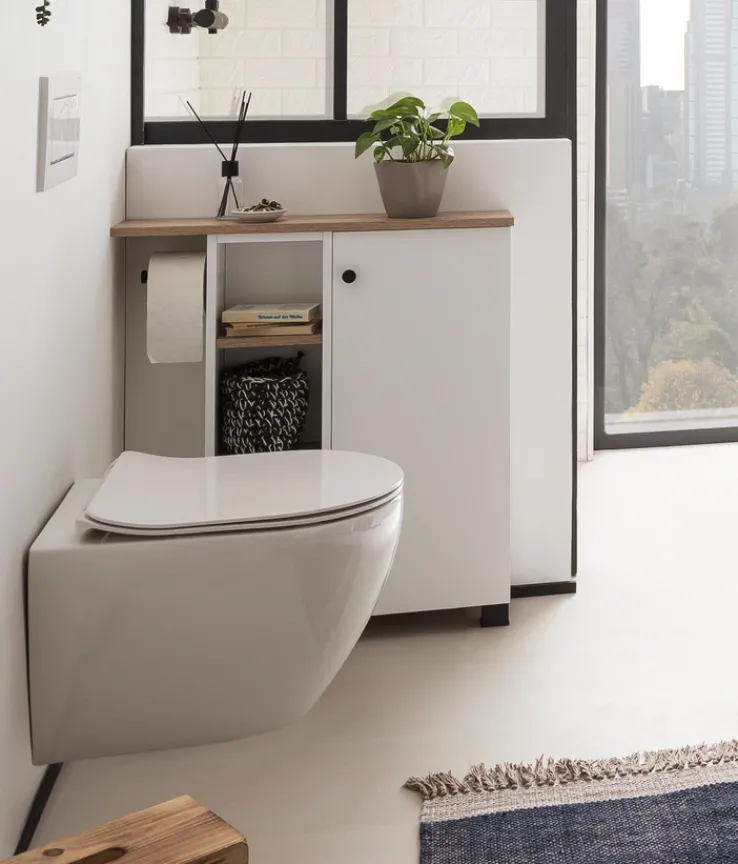 Mit seiner Tiefe von gerade einmal 17 cm, bei einer Breite von 70,7 cm und einer Höhe von 76,8 cm, ist der Bad-Unterschrank BALTO geradezu prädestiniert für kleine Bäder oder einen Platz in einer schmalen Nische. Sein Korpus ist aus weißer Holznachbildung gefertigt und mit Ablageböden in hellem Braun abgesetzt. Füße, Türknauf, Füße sowie ein praktischer Toilettenpapierhalter setzen interessante Akzente in Schwarz. Der Unterschrank verfügt über ein offenes Fach mit zwei Einlegeböden und eine Tür, hinter der sich ein weiteres Fach mit zwei Böden verbirgt. Somit bietet er großzügigen Stauraum für Handtücher, Kosmetika und vieles mehr.