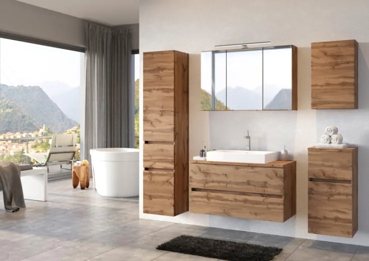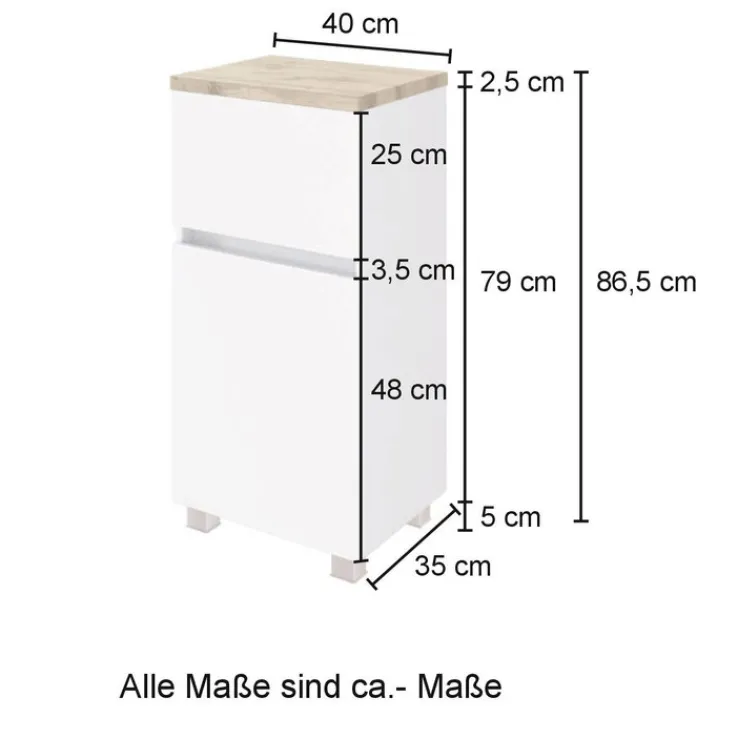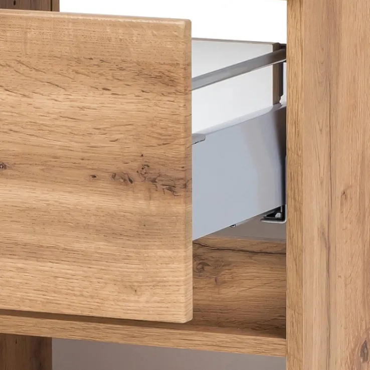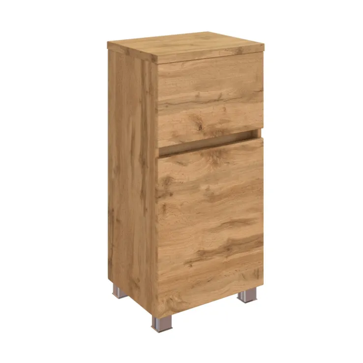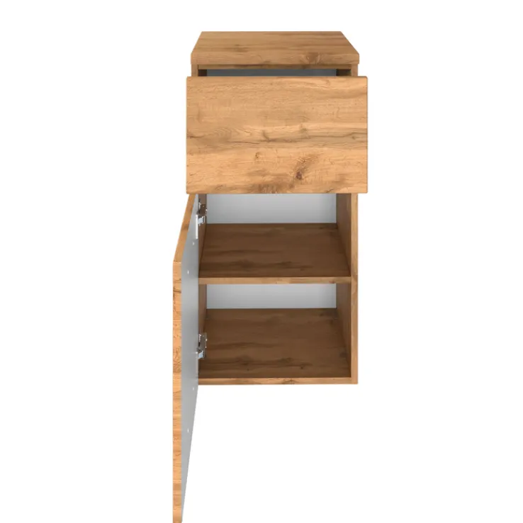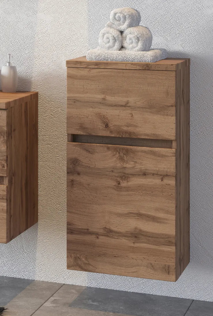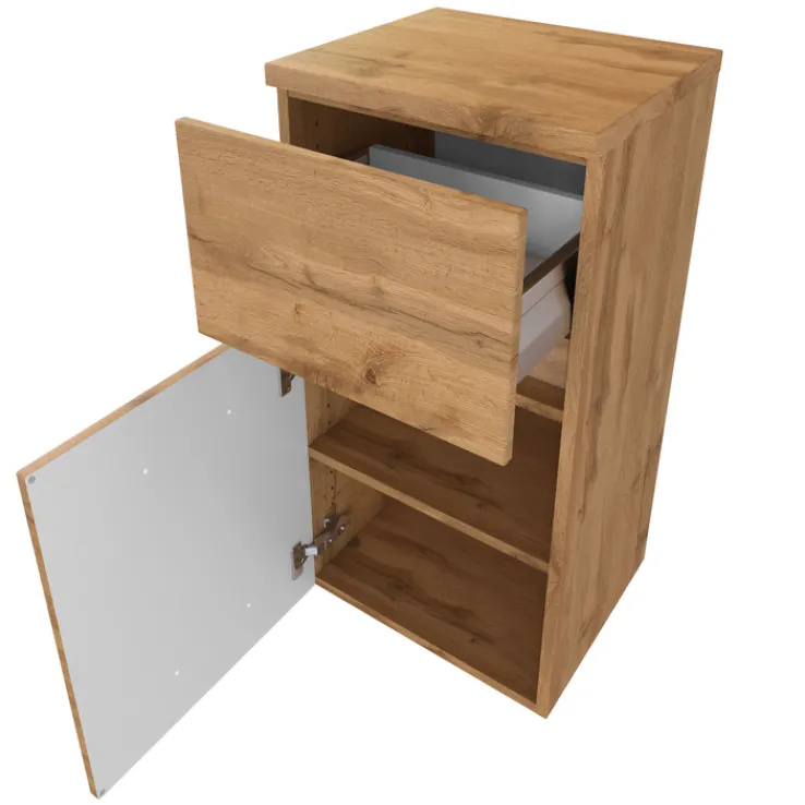 Im Inneren des Schranks für das Bad ist viel Platz für Utensilien wie Cremes und Handtücher. Hinter der Türe ist der Stauraum mit einem Einlegeboden gestaltet. Das Modell besteht aus Spanplatten, deren Holzdekor der Struktur der Wotaneiche nachempfunden ist. Die vier Füße des praktischen Möbelstücks sind aus robustem Kunststoff in der Farbe Silber gearbeitet. Die Schublade lässt sich mithilfe einer Reling öffnen.