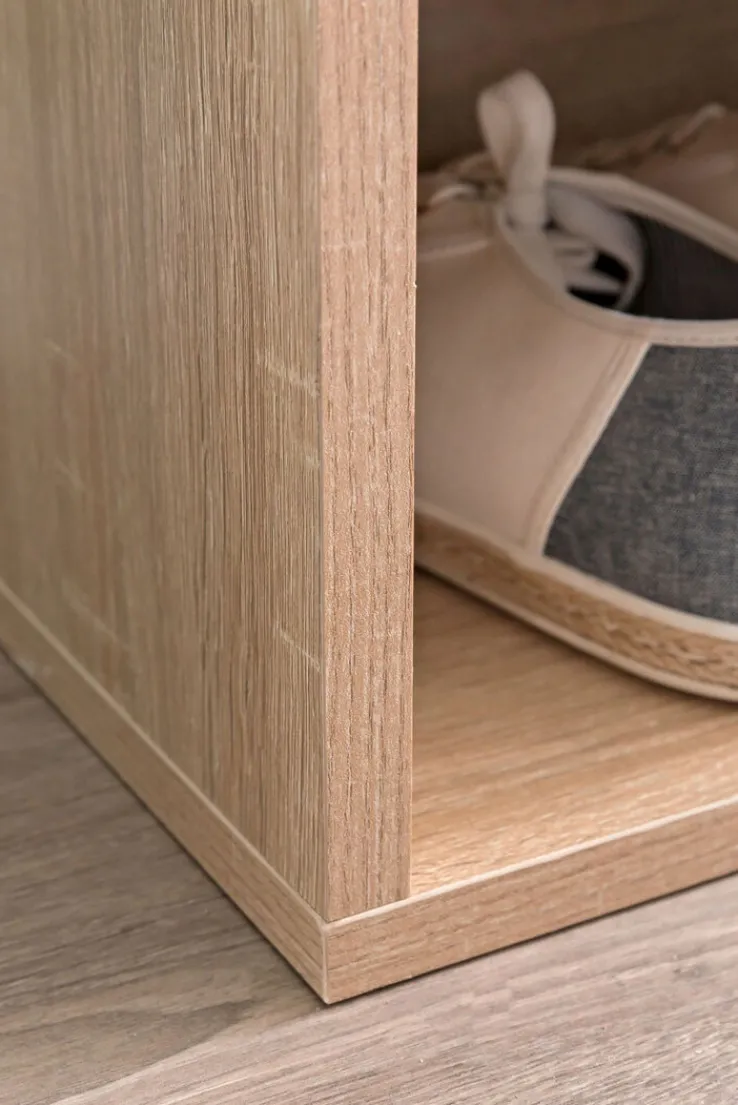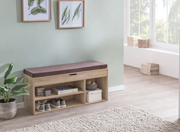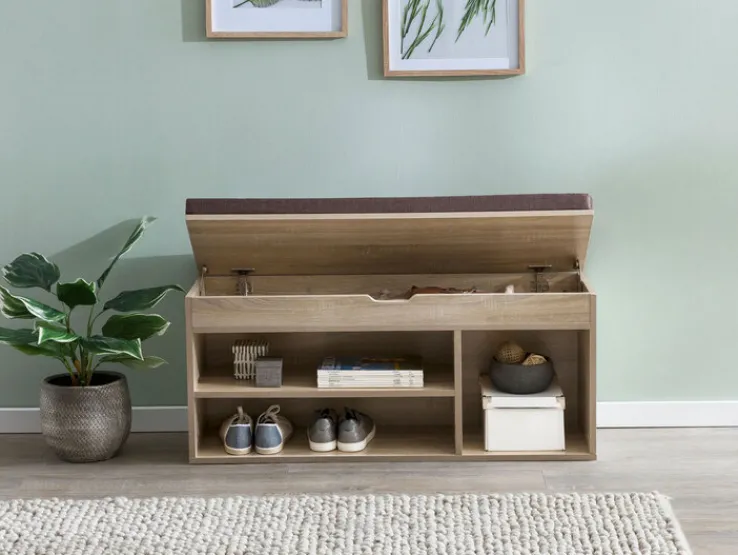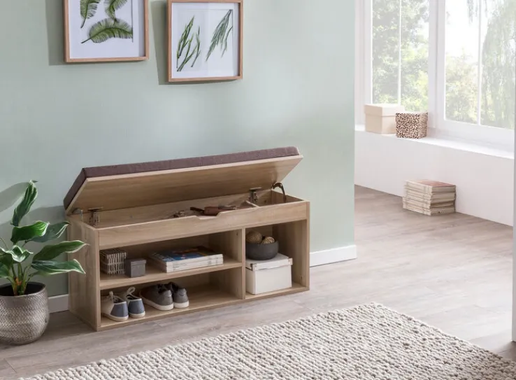 Dank der Bank wird das Aufräumen zum Kinderspiel. Drei offene Fächer im unteren Bereich bieten Platz für Schuhe oder Kartons, für dekorative Accessoires oder Zeitschriften. Beim Anheben der Sitzfläche öffnet sich ein weiteres Fach, in dem beispielsweise elektronische Geräte, Tagesdecken und Kissen, Handtasche oder Cityrucksack untergebracht werden können.