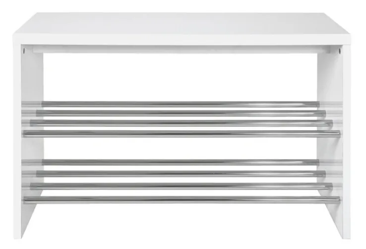Diese moderne Bank in weiß hat eine Größe von 81 x 55 x 30 cm und ist Sitzgelegenheit und Schuhregal zugleich.