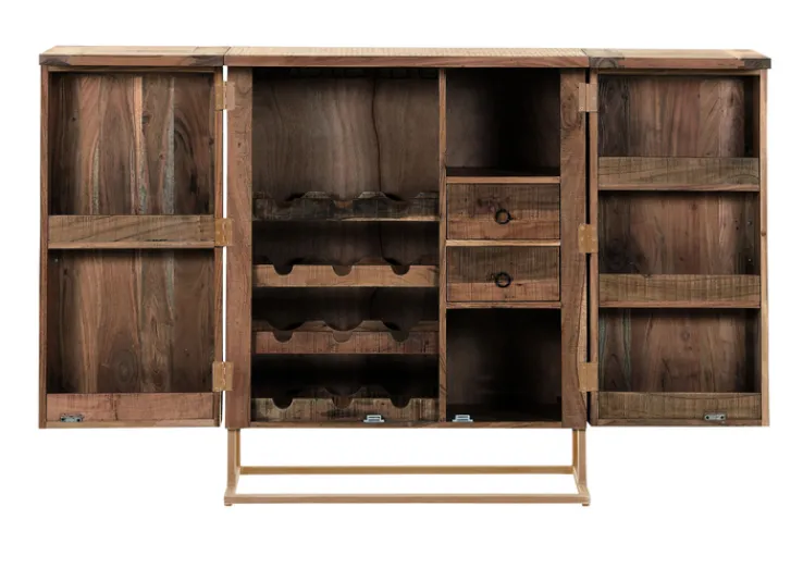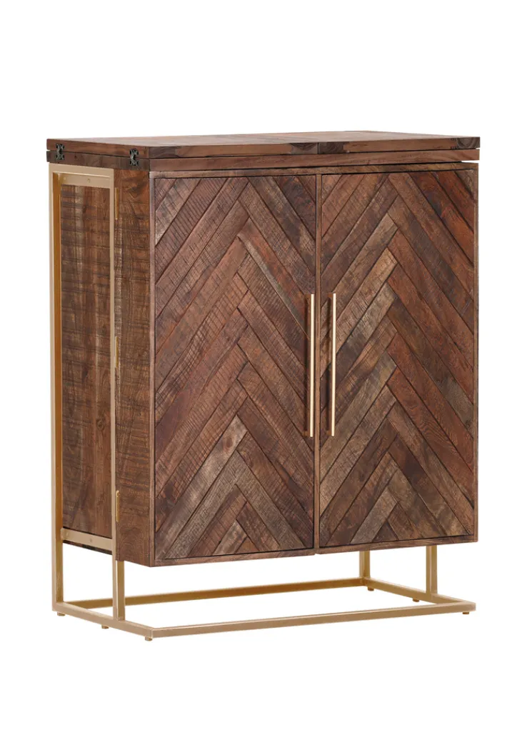 Der Barschrank „LA ESPINA“ vereint modernes Design mit funktionaler Eleganz. Mit einer Breite von 80 cm, einer Höhe von 100 cm und einer Tiefe von 50 cm bietet er ausreichend Stauraum für Ihre Barutensilien. Der Schrank besteht aus hochwertigem Akazienholz, das in einer ansprechenden Fischgrät-Optik gestaltet ist. Die warme braune Farbgebung wird durch goldfarbene Metallakzente ergänzt, die dem Möbelstück einen Hauch von Luxus verleihen.