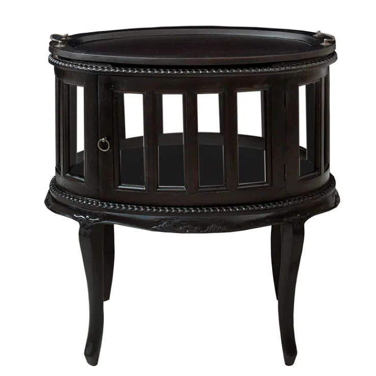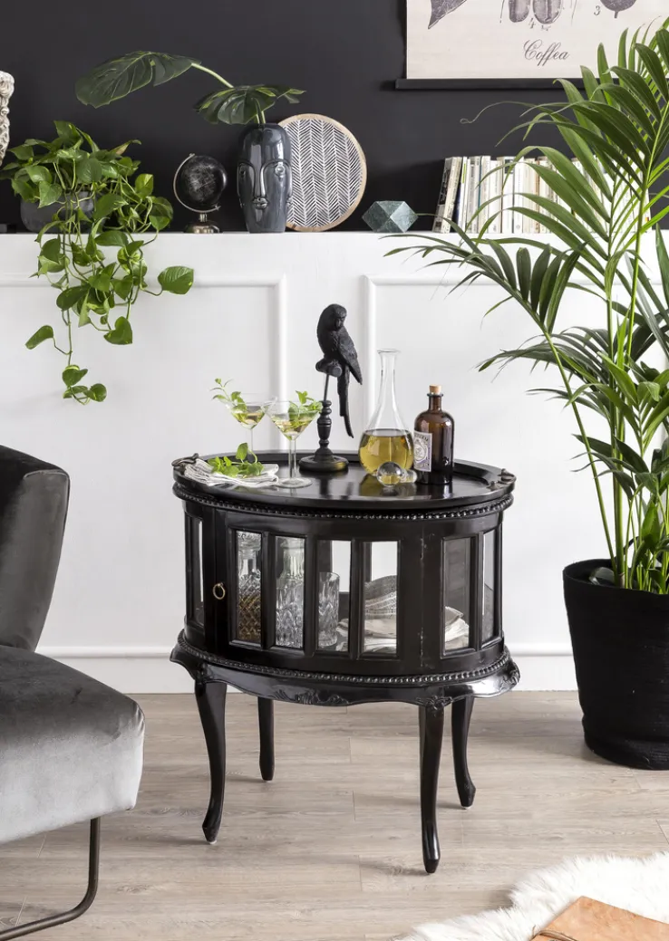 Der Barschrank ist die ideale Wahl für Wohnzimmer und Esszimmer. Wer eine Bar hat, sollte es dort einsetzen. Das Modell ist rund 48 cm tief und besitzt eine ovale Form. Die geschwungenen Füße und andere optische Details erinnern an antike Möbel. Das Teekästchen umfasst ein geschlossenes Fach, das durch die Glaseinsätze von allen Seiten einsehbar ist. Es gibt eine feine Tür, durch die es innen dekoriert werden kann. Oben auf liegt zudem ein abnehmbares Tablett.