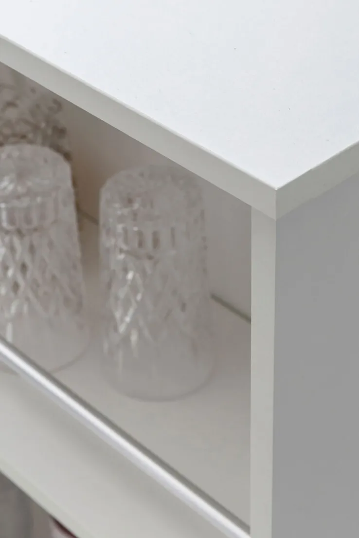 Der weiße Bartisch 120 × 60 cm ist in einer weiteren Farbe erhältlich. Das Möbelstück eignet sich als Ergänzung im Wohnbereich und bietet in drei Fächern Platz für Partyzubehör und Co.