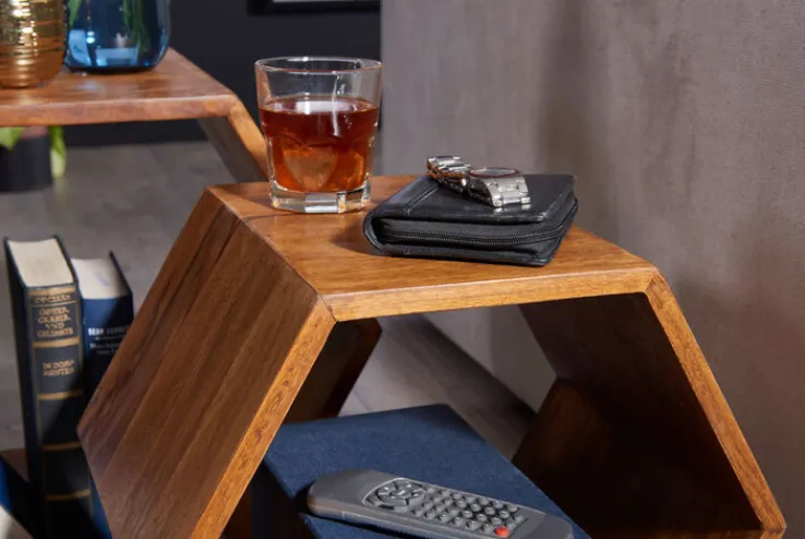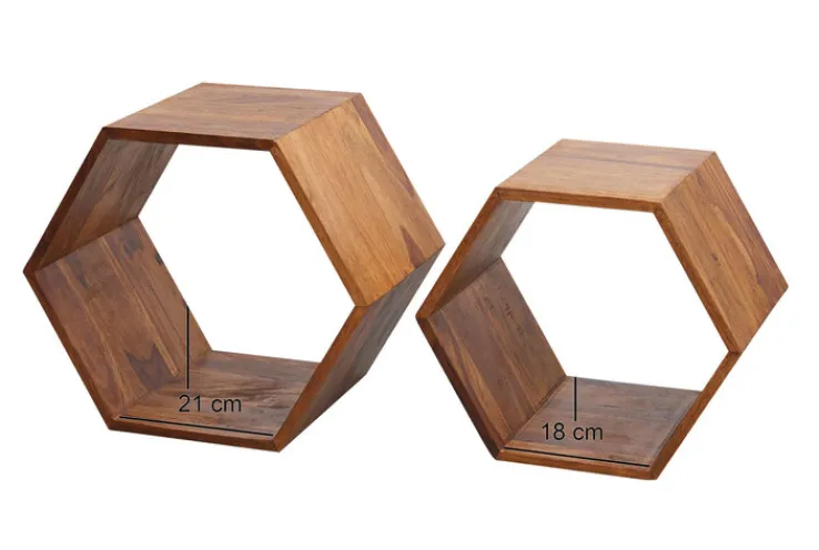 Die sechseckigen Beistelltische in der Form einer Honigwabe kommen in zwei Größen in den Wohnraum. Dank der Verwendung von massivem Sheeshamholz sind sie robust und lassen sich mit einem Gewicht von maximal 5 kg belasten. Das Holz ist in Honigfarbe gebeizt und strahlt dadurch Wärme und Natürlichkeit aus. Dadurch erhält auch der Wohnraum ein gemütliches Ambiente. Zusätzlich zum spannenden Design überzeugen die Beistelltische mit je zwei kleinen Ablagen.