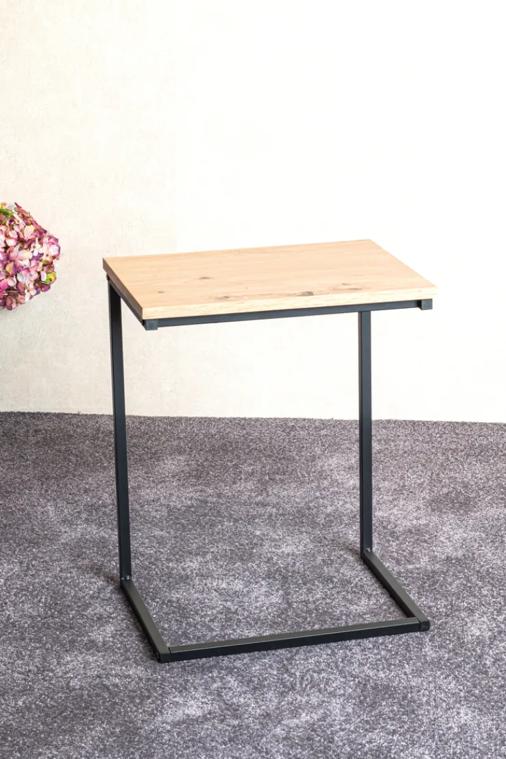 Der kleine Tisch aus Metall und Holznachbildung sowie Kunststoff kann bis zu acht Kilogramm belastet werden. Das Modell selbst wiegt nur 2,3 Kilogramm. Das Metallgestell verläuft wie ein Rahmen vom Boden zur Tischplatte. Dieses Gestell ist zu einer Seite offen konzipiert, sodass sich der Beistelltisch mühelos näher an die Sitzfläche von Sofa und Sessel ziehen lässt. Die Melaminharzbeschichtung der Platte ist pflegeleicht.