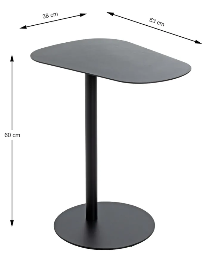 Dieser schwarzfarbige BEISTELLTISCH ist 60 cm hoch, 53 cm breit und hat eine Tiefe von 38 cm. Alternativ gibt es das Produkt noch in den Farbvarianten weiß, rot und grün. Er ist aus stabilem Metall gearbeitet. Dessen Oberfläche wurde mit einer hochwertigen Pulverbeschichtung veredelt. Die ovale Ablagefläche ruht auf einem einzelnen Fuß und kann mit bis zu 15 kg belastet werden.