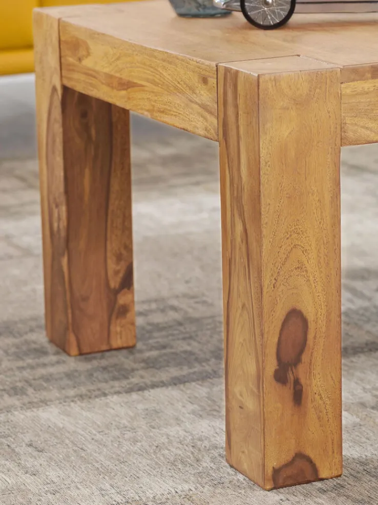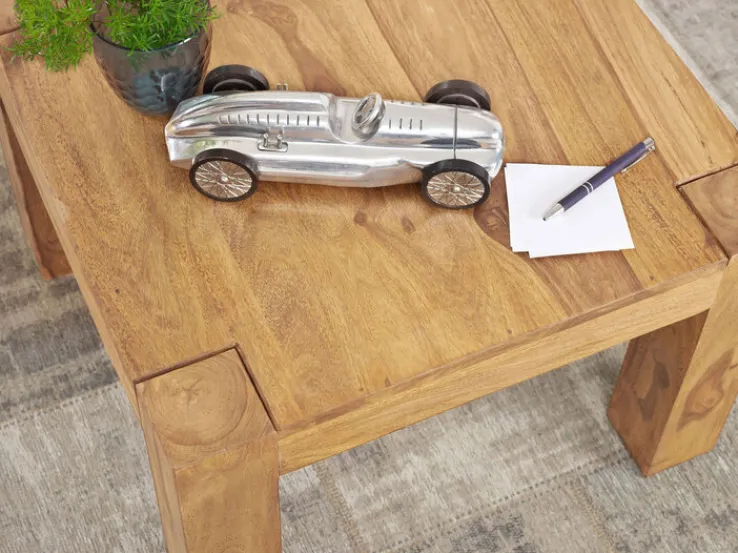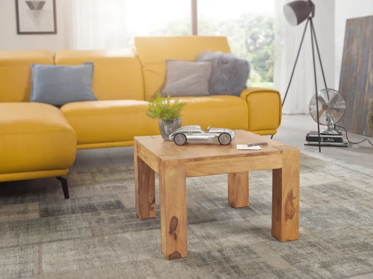 Der Beistelltisch bietet viel Platz für die Dinge, die man in der Nähe haben möchtet. Er eignet sich als Buchablage und als Abstellmöglichkeit für die Kaffeetasse oder das Glas Wein. Auch eine kleine Tischlampe oder eine Vase mit Blumen kann den Tisch schmücken. Der kleine Beistelltisch mit quadratischer Tischfläche und Vierfußgestell ist in Handarbeit aus massivem Akazienholz gefertigt und hat einen schönen Holzton. So trägt er zu einem gemütlichen Ambiente bei.