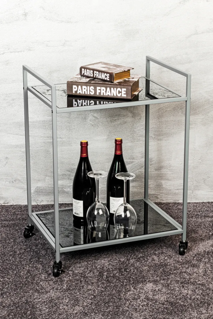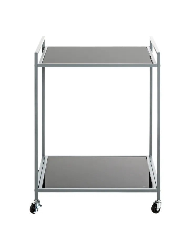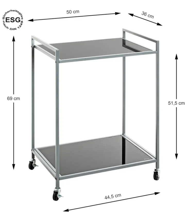 Der in den Farben Schwarz und Grau gestaltete Beistelltisch auf Rollen ist ideal zum Servieren von Speisen geeignet. Das Modell ist 50 Zentimeter breit, 69 Zentimeter hoch und 36 Zentimeter tief. Der Tisch bietet zwei Ebenen für die Ablage von Tellern, Zeitungen und vielen anderen Dingen.