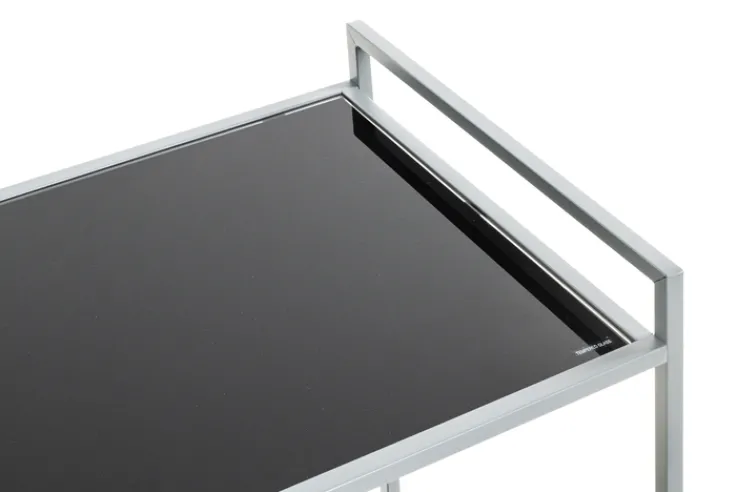 Zwei der vier Rollen des rechteckigen Vierfußgestells lassen sich feststellen, sodass dieser rollbare Tisch sicher an jedem Platz im Raum steht. Jede der beiden Platten aus Sicherheitsglas ist mit einem Gewicht von bis zu sechs Kilogramm belastbar. Insgesamt wiegt das Modell 6,46 Kilogramm. Die untere Tischplatte befindet sich in einer Höhe von 8,5 Zentimetern.