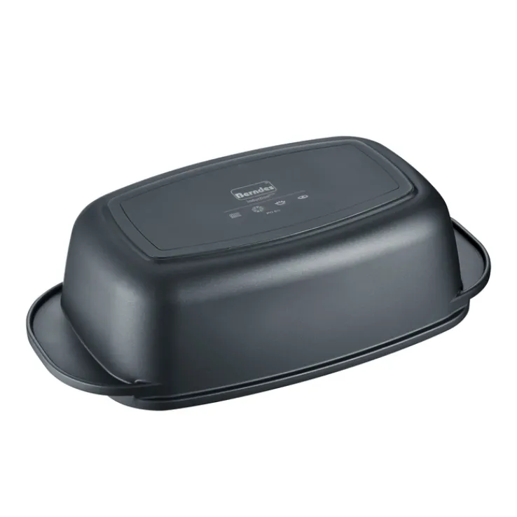 Der rechteckige Bräter von Berndes mit Induktionsboden eignet sich für alle gängigen Herdarten. Er ist ideal, um das Gargut zunächst auf der Kochplatte anzubraten und hinterher im Ofen zu schmoren. Seine hochwertige Quarzversiegelung ist PFAS- und PTFE-frei und ermöglicht eine gesunde Zubereitung von Lebensmitteln. Der große Glasdeckel erlaubt, den Garvorgangs durchgängig zu kontrollieren. So lässt sich einfach erkennen, wann das Gericht fertig ist.