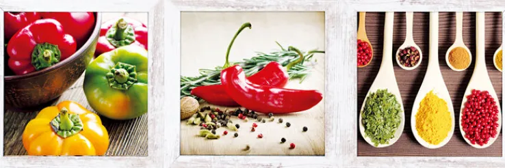 Dieses Wandbild-Set aus der Serie GEWÜRZE umfasst drei quadratische Bilder mit einer Seitenlänge von jeweils 23 cm. Die Motive zeigen farbenfrohe Darstellungen aus dem Bereich Gewürze und Kräuter: Ein Bild zeigt verschiedenfarbige Paprikaschoten in Rot, Gelb und Grün, ein weiteres Motiv präsentiert rote Chilischoten mit Pfefferkörnern und Kräutern, während das dritte Bild eine Auswahl an Gewürzen auf Holzlöffeln, darunter getrocknete Kräuter, gelbes Gewürzpulver und rote Beeren, abbildet. Die Darstellungen sind auf weiß gerahmten MDF-Platten mit einer Tiefe von 2,1 cm umgesetzt und vermitteln durch ihre lebhafte Farbgebung eine natürliche und frische Atmosphäre.