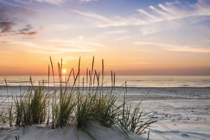 Das Wandbild zeigt eine ruhige Strandlandschaft mit feinem Sand, Grasbüscheln im Vordergrund und dem Meer im Hintergrund. Die Sonne steht tief am Horizont und taucht den Himmel in warme Orangetöne, während sich gleichzeitig kühle Blautöne im oberen Bereich abzeichnen. Die sanften Wolken und der ruhige Wellengang verstärken die entspannte Atmosphäre. Das Motiv Sonnenuntergang am Meer ist auf eine Leinwand aufgezogen und besticht durch seine detailreiche, naturgetreue Darstellung.