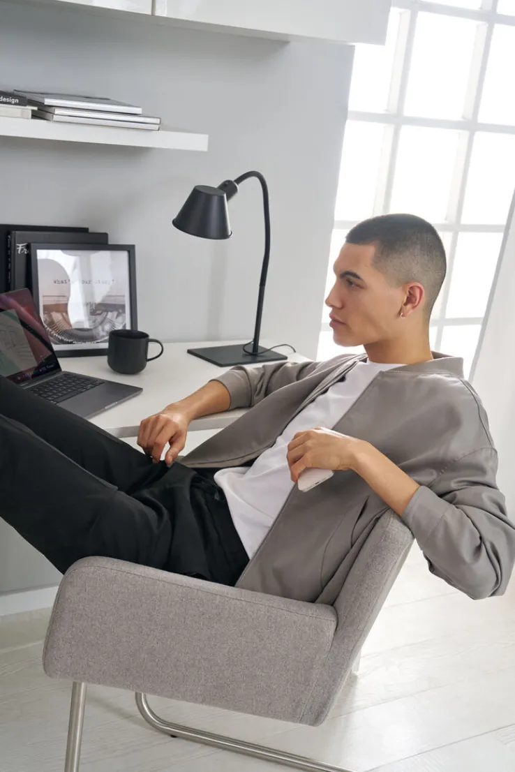 Die formschöne Arbeitsplatzleuchte lässt sich bequem mithilfe des am Gehäuse der Fassung befindlichen Schalters ein- und ausschalten. Die flexibel verstellbare Tischleuchte kann bis zu einer Tiefe von 40 Zentimetern erweitert werden. Das Modell wiegt 2,7 Kilogramm und überzeugt daher mit einer hohen Standsicherheit. Die Bürolampe mit der Schutzklasse 2 und der Schutzart IP20 wird ohne Leuchtmittel geliefert.