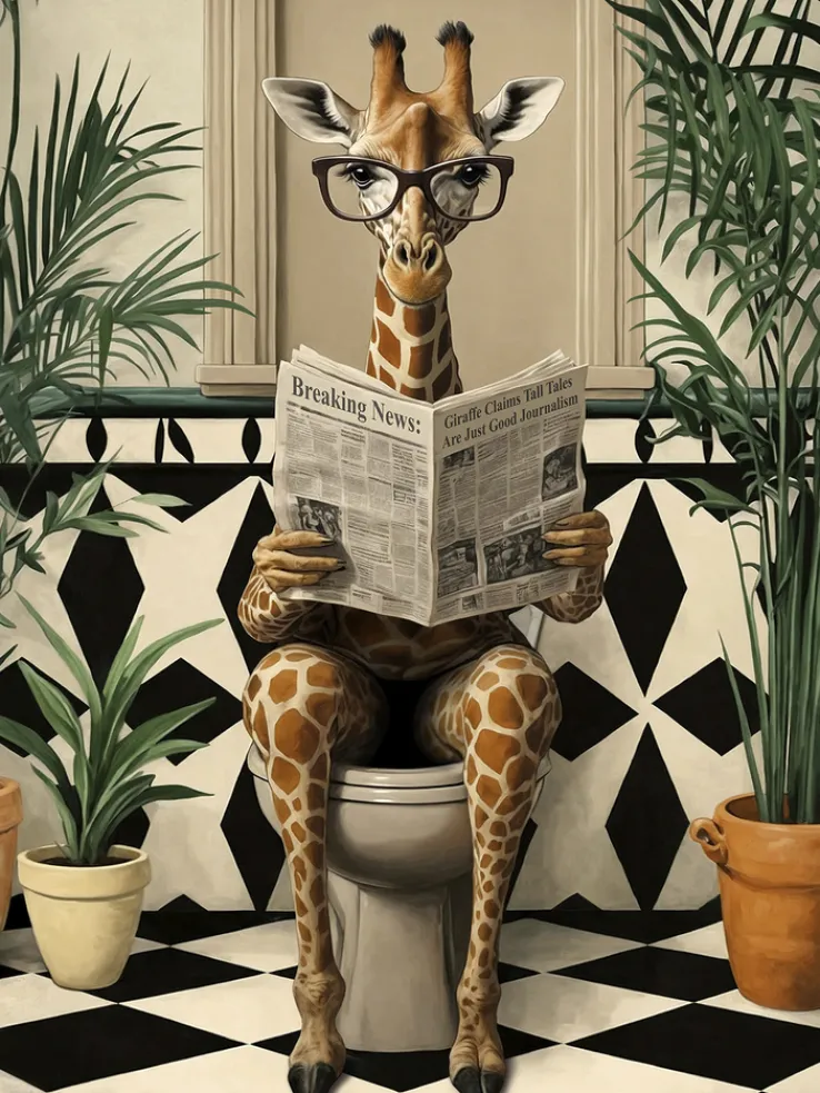 Dieses Canvas-Art Wandbild zeigt eine humorvolle Szene: Eine Giraffe sitzt auf einer Toilette, trägt eine Brille und liest eine Zeitung. Das Bild ist detailreich gestaltet und besticht durch eine mehrfarbige Ausführung. Im Hintergrund sind grüne Zimmerpflanzen und ein schwarz-weiß gemusterter Fliesenboden sichtbar, was dem Motiv einen modernen und zugleich verspielten Charakter verleiht. Die Maße des Wandbildes betragen 60 cm in der Breite, 80 cm in der Höhe und 2 cm in der Tiefe. Das Gewicht liegt bei 1,11 kg. Das Motiv zeichnet sich durch kräftige Kontraste und eine lebendige Farbgebung aus, die zu einem Blickfang in verschiedenen Wohnbereichen wird.