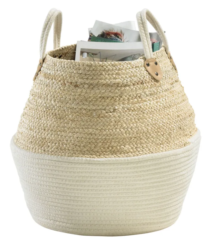 Der einzigartige Aufbewahrungskorb besteht aus Baumwolle und Maisblättern. Die Naturmaterialien in den Farben weiß und Braun sind zu einem starken Material verflochten und fest miteinander vernäht. Zum Transport des Korbs sind zwei Griffe an der Öffnung angebracht. Die Griffe sind mit jeweils drei Metallnieten am Aufbewahrungskorb befestigt.