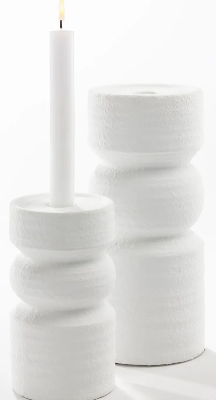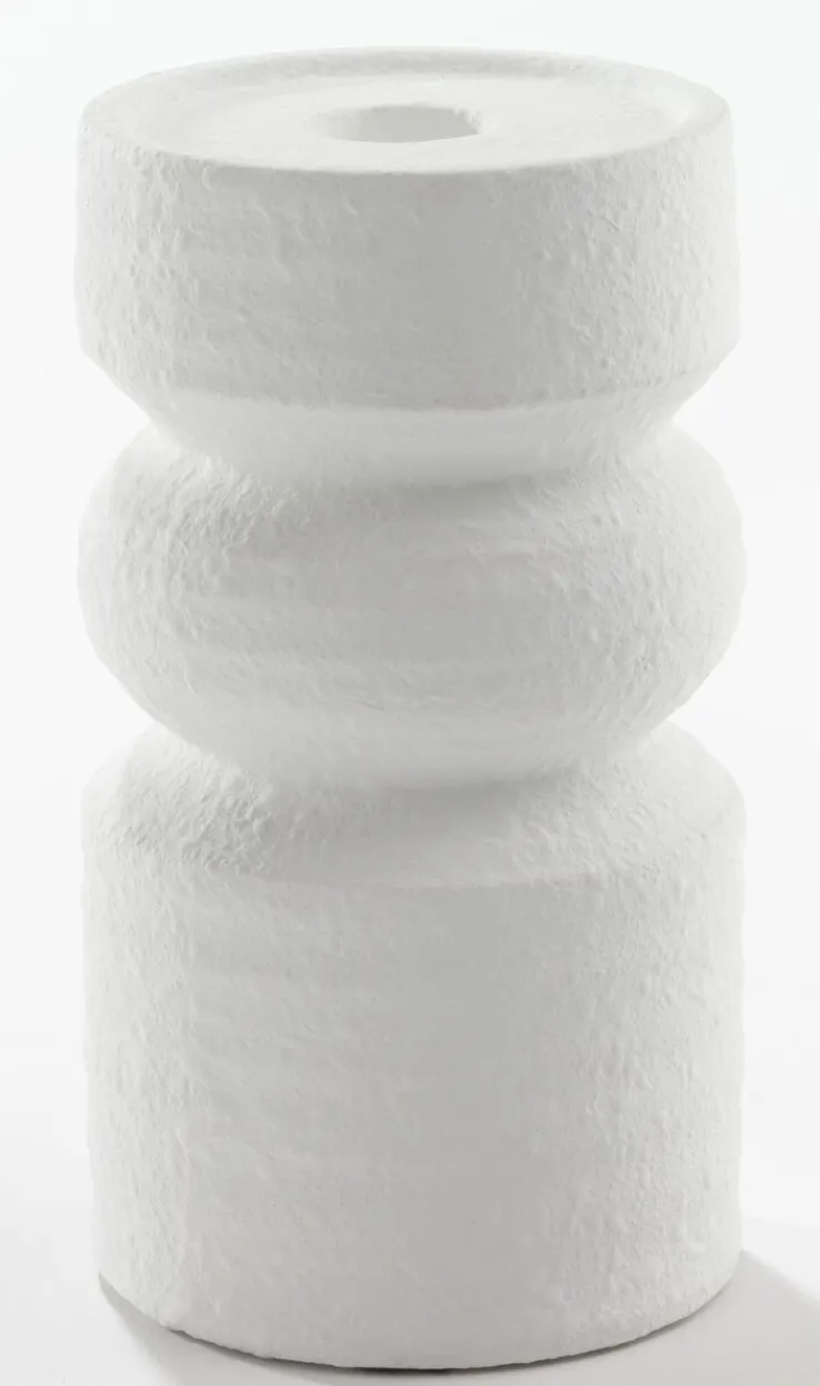 Mit einer Höhe von 20 cm und einem Durchmesser von 11,5 cm eignet sich der hübsche weiße Kerzenständer auch sehr gut für kleinere Tische und Oberflächen. Hergestellt wurde er aus Keramik (Terrakotta).