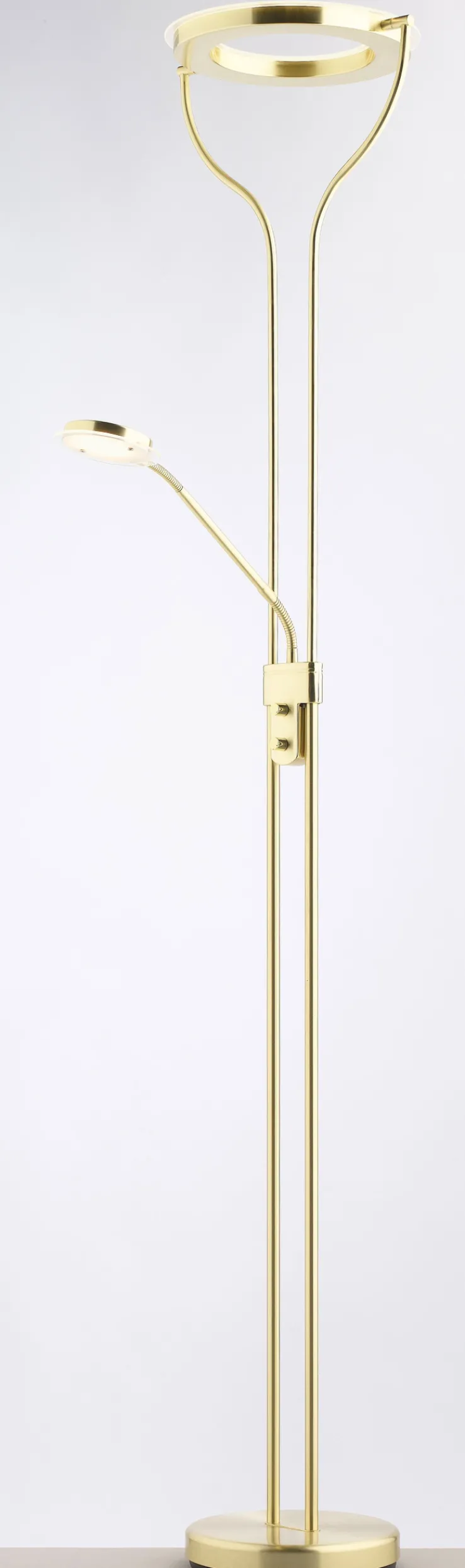Der casaNOVA LED Deckenfluter mit Leselampe SEATTLE II ist 180 cm hoch. Er verfügt über zwei getrennt schaltbare, dimmbare Lichtquellen. Die Leselampe aus messingfarbenem Metall ist verstellbar.