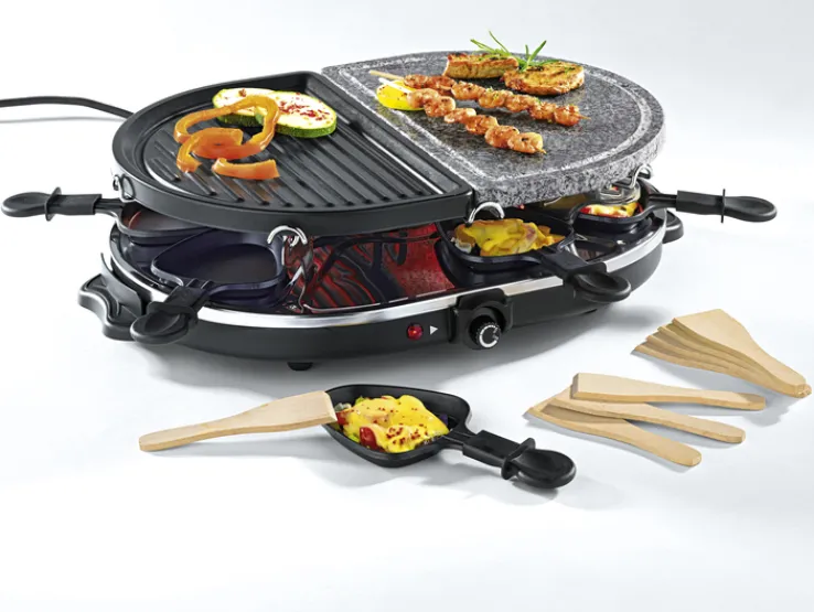 Der Grill unterscheidet sich von herkömmlichen Racletts, denn er besitzt einen Naturgrillstein. Zu diesem Zweck ist die obere Abdeckung in zwei Bereiche geteilt: einerseits der graue Naturstein, andererseits die normale Grillablage. Unter diesen Abdeckungen finden 8 Grillpfännchen mit Antihaftbeschichtung Platz. Dazu gibt es 8 Spatel, mit denen der Pfanneninhalt nach dem Garen leicht herausgeschabt und auf die Teller befördert wird. Ein regelbarer Thermostat sorgt dafür, dass die Hitze nicht zu stark wird, sodass alle Zutaten schön gleichmäßig garen und bräunen. Raclette ist ein typisches Gemeinschaftsessen. Der ebenso optisch ansprechende wie funktionale casaNOVA Raclette-Grill wird am besten mit der ganzen Familie und ein paar Freunden eingeweiht und fernerhin benutzt. Der Voraufwand für ein Raclette ist vergleichsweise gering, der Spaß am Essen dafür umso größer. Denken Sie auch an einen Beistelltisch, denn oft ist auf dem Esstisch nicht genügend Platz für alle Zutaten.