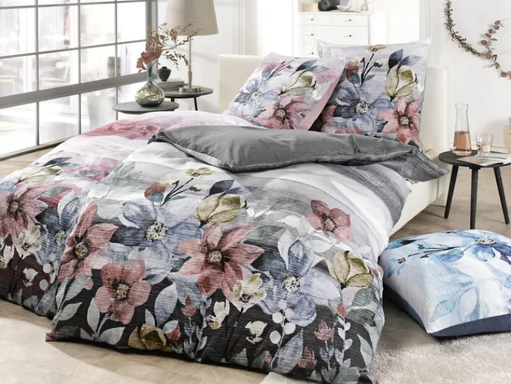 Die mehrfarbige casaNOVA Satin-Bettwäsche FRIDA ist eine praktische Wendebettwäsche. Sie präsentiert sich auf der einen Seite einfarbig in Grau und auf der anderen Seite mit einem schönen Blumenmuster auf grau-weißem Untergrund.