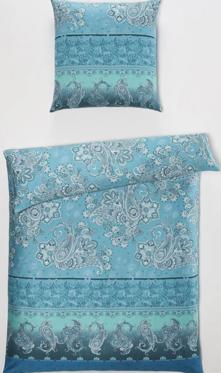 Die Bettwäsche SUN von casaNOVA in der Größe 135 x 200 cm besteht aus Satin. Sie überzeugt durch ihr elegantes Design in verschiedenen Blautönen, das florale Motive mit dem beliebten Paisley-Muster kombiniert.