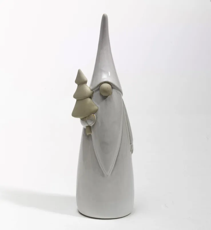 Die Figur zeigt eine stilisierte Form mit einem spitzen Hut und einem kleinen Baum in der Hand, was ihr einen charmanten und zeitlosen Charakter verleiht. Die glatte Keramikoberfläche unterstreicht die hochwertige Verarbeitung und verleiht der Figur eine ansprechende Haptik. Diese Dekofigur ist eine perfekte Ergänzung für ein klassisches Wohnambiente und eignet sich hervorragend als Blickfang auf Regalen oder Tischen.