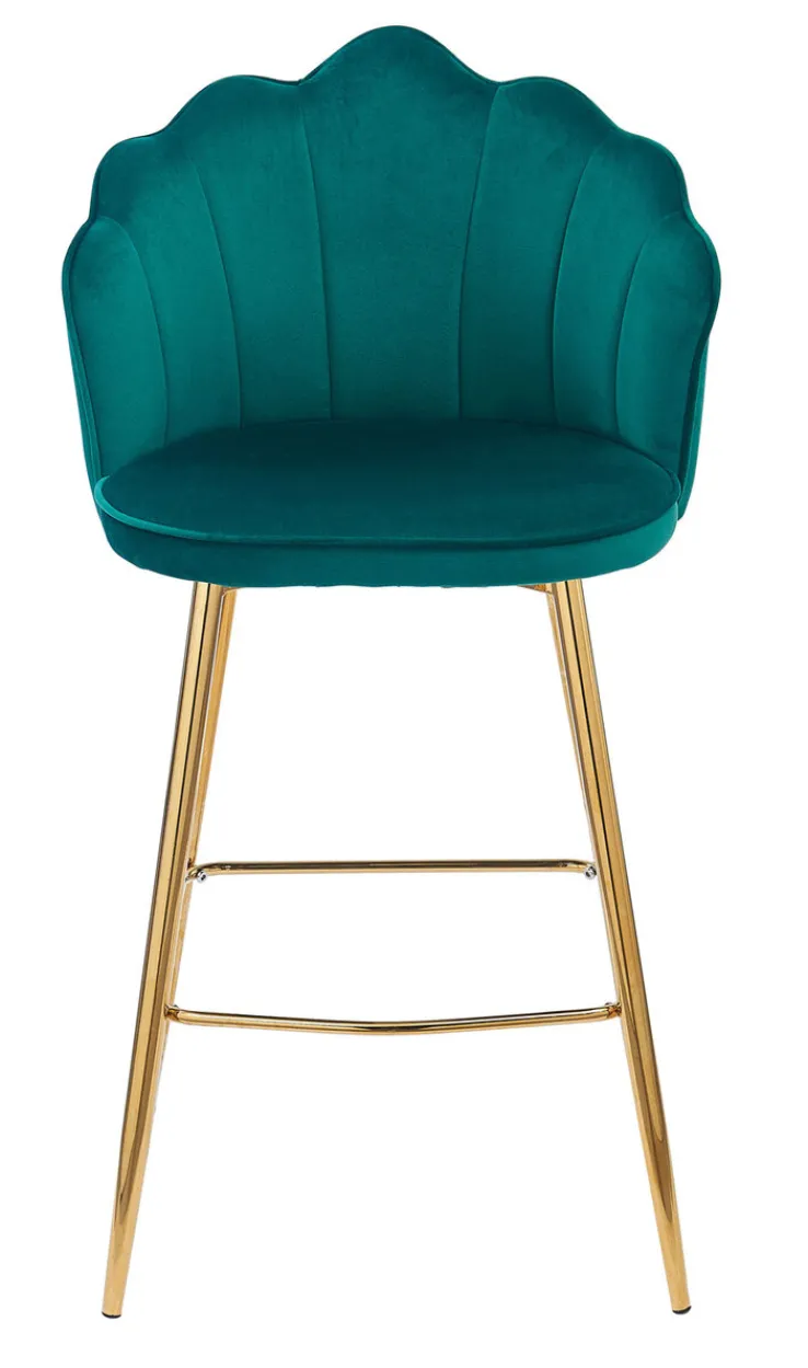 Der CASAVANTI Barhocker misst 53 x 100 x 54 cm und ist mit einer Fußbank ausgestattet. Diese sorgt gemeinsam mit dem gepolsterten Sitz mit halbhoher Rückenlehne für Komfort. Den Sitz mit spannender Muschelform und grünem Samtbezug kombiniert der Barstuhl mit einem goldfarbigen Vierfußgestell aus Metall. Dank stylischer Optik lässt sich der Barhocker mit modernen und klassischen Möbeln kombinieren und verleiht der Hausbar im Nu ein elegantes und gemütliches Ambiente.