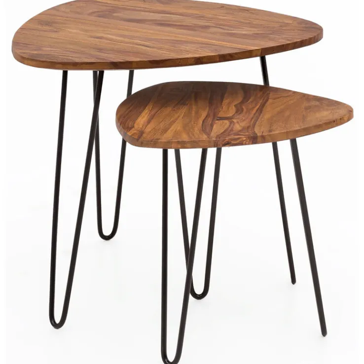 Die Tischplatte besteht aus massivem Holz (Rosenholz Sheesham) und zeigt eine angenehm lebhafte Maserung. Das filigrane Gestell ist aus Eisen gefertigt. Die Beistelltische können einzeln an verschiedenen Stellen platziert werden. Sie sehen aber auch sehr attraktiv aus, wenn der kleinere ein wenig unter den höheren geschoben wird. Beliebte Standorte sind der Stellplatz neben dem Lieblingssessel oder der Couch.