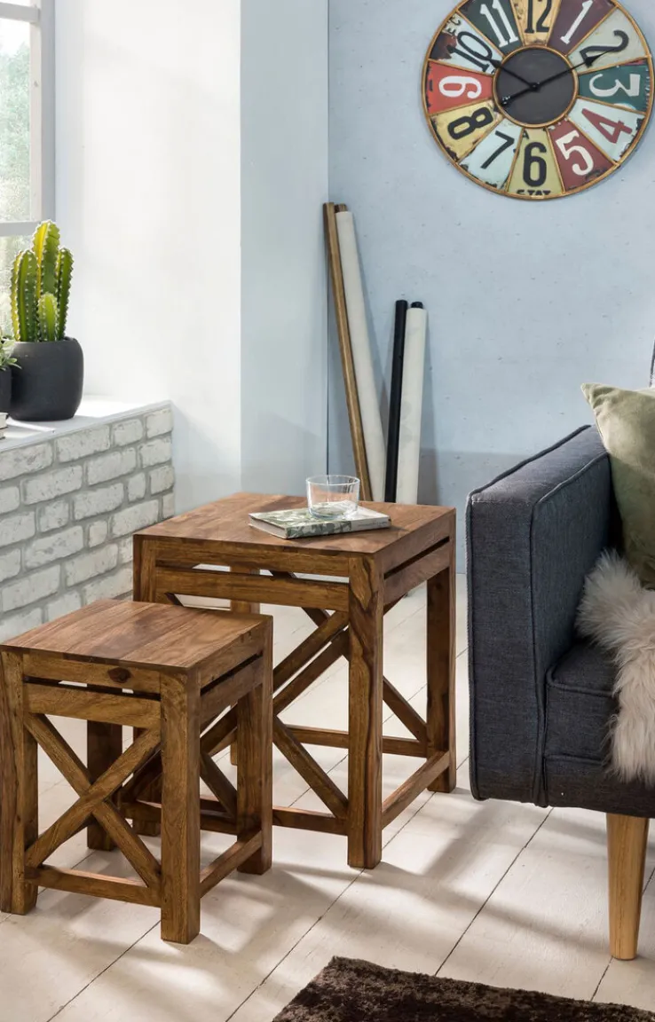 So klein Beistelltischchen auch sein mögen: Sie sind ebenso nützliche wie schöne Möbelstücke. Direkt nebeneinander ergibt der Beistelltisch 2er-Set Sheesham von CASAVANTI ein schönes Ensemble. Der größere misst 40 x 50 x 40 cm, der kleinere 39 x 40 x 39 cm. Alternativ lassen sie sich getrennt aufstellen. Die Tischchen aus massivem Holz sehen schön im Wohnzimmer, Schlafzimmer oder Wintergarten aus. Auch in eine Landhausküche oder ein Badezimmer passen sie ausgezeichnet als Ablagemöglichkeit.