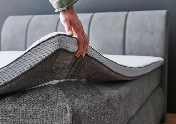 Weiterhin gehört ein integrierter Topper mit Kaltschaum zum Lieferumfang. Das komfortable Bett verfügt über zwei Boxen. In seinen beiden Basisgestellen sind Taschenfederkern-Polsterungen untergebracht. Im Bezug befinden sich zwei Kerne. Das elegante Bett überzeugt mit seiner hochwertigen Qualität und der schicken Farbe. Grau passt zu den meisten Interieurs im Schlafzimmer. Es kann problemlos mit Schwarz, Grau und Weiß, aber auch mit bunten Farben kombiniert werden.