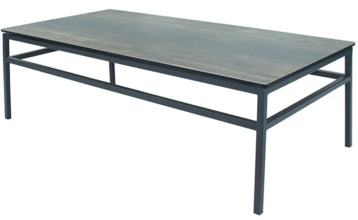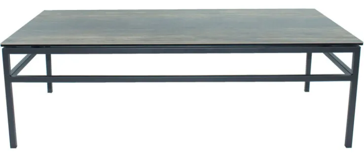 Der CASAVANTI Couchtisch misst in Breite und Höhe 120 x 38 cm. Er zeigt eine dunkelbraune Tischplatte als Holznachbildung und ein schwarzes Gestell aus Edelstahl, das pulverbeschichtet ist. Der rechteckige Tisch ist 60 cm tief.