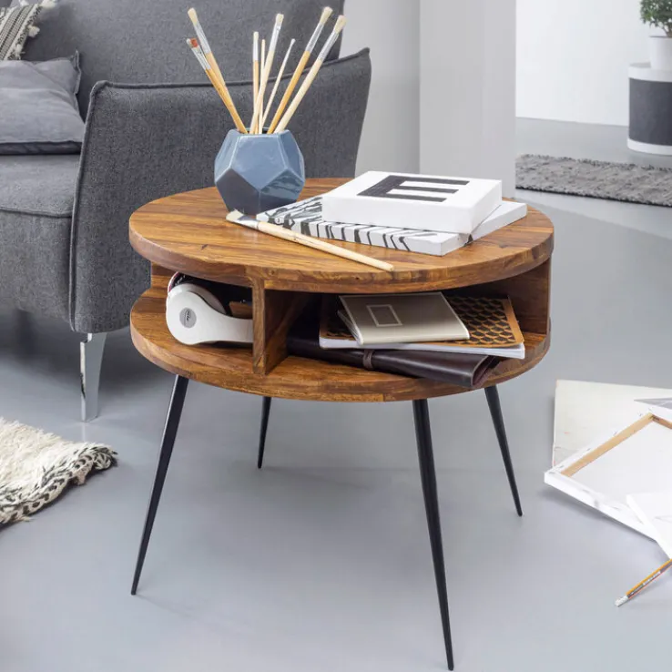 Der runde CASAVANTI Couchtisch mit einem Durchmesser von 60,0 cm ist aus massivem Sheesham-Holz gefertigt. Die Höhe des Tisches beträgt 45,0 cm. Mit dieser kompakten Bauform und einer modern gestalteten Optik kann der Couchtisch viele Einrichtungsstile im Wohnbereich ergänzen. Die Tischbeine bestehen aus einem pulverbeschichteten Vierfußgestell mit leichter Schräge. Angefertigt aus Schmiedeeisen sind diese in schwarzer Farbe matt lackiert.